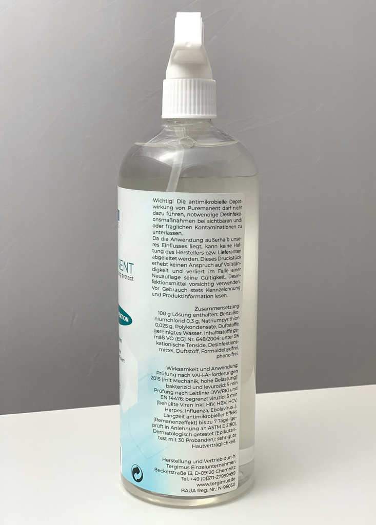 PUREMANENT initially contains 0.0% alcohol, as this evaporates quickly. The germ-inactivating active ingredients are modern quaternary ammonium compounds, which act within a short time and adhere well to surfaces. But the special feature of our disinfectant is an additive that only PUREMANENT has. It acts like a preservative by making the germicidal active ingredients adhere extremely well to the surfaces. The pleasant thing about it is that you cannot see or feel the effect (no stickiness). On the contrary: the additive creates an easier-to-clean effect on surfaces (easy-to-clean effect), which is even dirt-repellent to a limited extent. Even after thousands of touches, the protection remains active. Even subsequent cleaning with water and neutral detergents cannot destroy the active deposit. Watch our video on YouTube that explains the full effectiveness.
